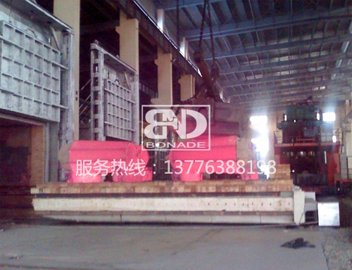 5、臺車耐火砌體采用高鋁定型磚結構,與爐體密封效果好,耐壓強度高。臺車面擱置墊鐵供堆放工件用。臺車幫板全部采用澆筑件,保證車體不變形及耐用性。爐車與爐襯的密封采用耐火纖維密封塊電動推桿自動壓緊結構。側密封的開、閉與爐車進出連鎖。