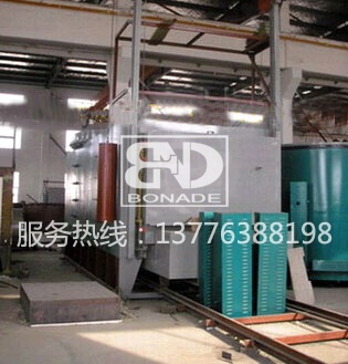 臺車框架采用型鋼焊接成形,其鋼性保證在滿負荷下不變形。內用耐火磚砌筑,易碰撞部位和承重部位用重質磚砌筑,增強爐襯結構強度,臺車的行走采用自行式結構,由減速機傳動鏈輪帶動走輪在軌道上行走。臺車密封采用自動迷宮式結構和軟接觸雙密封,臺車進入爐內通過凸輪及滾輪斜面作用,自動升起后進行密封。臺車開出,該密封槽自動落下,密封槽內密封砂經加滿后即不必經常添加。臺車開出,爐門升降均為電動控制,配有電磁制動器,可防止慣性撞擊爐體,并且連鎖控制,即稍打開爐門后,自動切斷加熱元件,同時恢復臺車行走機構電源。爐門關閉到位后,自動切斷臺車行走機構電源,同時恢復加熱元件電源。