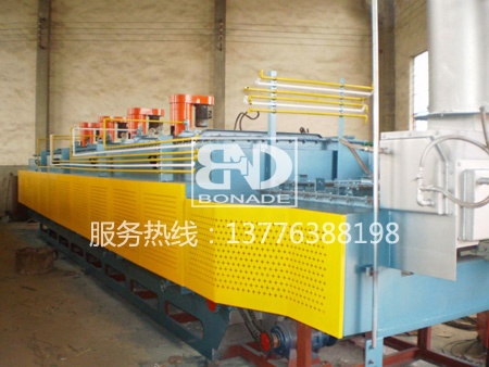適用于批量性機械零件(如鏈條、軸承、標準件、自行車零件、自攻螺釘、紡織五金)等淬火、滲碳、碳氮共滲等處熱理工藝。連續自動生產效率高,爐內有特定的強制換氣系統,滲透快,滲層深,處理后的工件質量穩定,表面光潔。本生產線是有淬火爐、油槽、提升機等組成。工件是利用間歇前進的網帶輸送,通過溫控的加熱區,落入淬火槽并由提升機取出。 淬火爐的基本結構:淬火爐的殼體是由型鋼和鋼板焊接而成,外殼為密封結構,采用耐高溫抗滲碳耐火材料砌成爐體。由耐熱合金鋼制成的活動底板支承和帶動著網帶及物料前進。采用特別設計的電加熱輻射管加熱,布置在爐膛的底部和頂部,性能穩定,壽命長。傳動機構由調速電機配上減速器組成,通過偏心輪機構帶動網帶裝載物料進出爐內,并根據需要調節運行速度。在爐頂裝有循環風機,使爐口保持正壓,并使爐內氣流加強循環,爐內溫度均勻性,熱穩定性進一步得到提高,有利于產品質量提高以及產量的增加。一套專用的電控柜對爐溫進行精確控制,控制精度可達±1°c。爐內氣氛控制系統,采用手動調節方式…………并可為用戶進行熱處理工藝設計,工件熱處理小試提供條件等。設備銷往全國各地,主要有浙江、江蘇、福建、廣東、湖南、河北、山東…………
