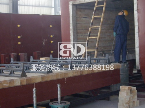 爐襯:該爐爐體部分采用全纖維,纖維根據爐膛尺寸定做成模塊,將纖維壓縮成塊狀進行現場筑棉,固定方式采用穿肖加鉤釘固定,即在塊狀纖維棉中均勻穿肖,然后用鉤釘鉤住穿肖,拉緊后與爐體焊接。在臺車耐壓部分采用高鋁磚砌筑,下部均有保溫磚保溫。